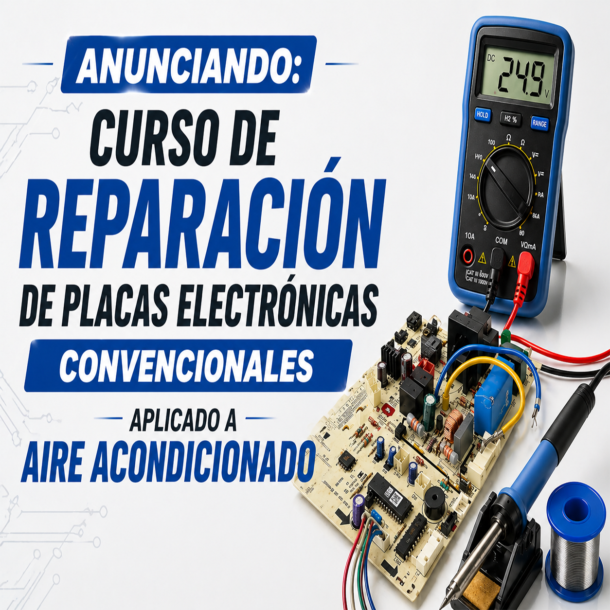 Curso práctico para aprender a diagnosticar y reparar placas electrónicas convencionales de aire acondicionado desde cero.